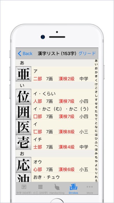 掲載されている漢字には読みだけでなく、漢字検定級別が表示されます。漢字検定勉強中の方が便利に使えます。また、書き順はアニメでチェックできるので、分かりやすく勉強になります。