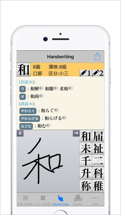 このアプリでは、自分が調べたい漢字をスマートフォンの画面を使って手書きで検索をすることができるので、読み方をよく知っていなくてもすぐに解説に辿り着くことができます。