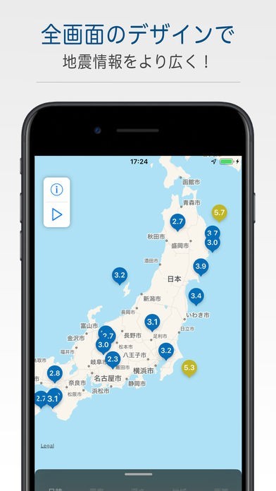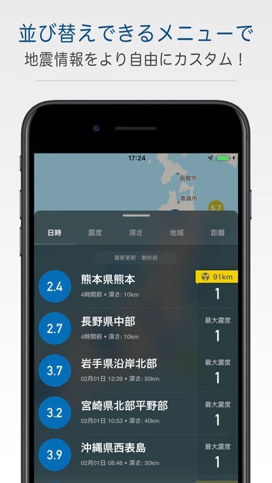 App Storeより引用地震情報はスマートでより、見やすくなりました!使いやすいデザインで、地震についての詳しい情報をすぐに取得できます!
