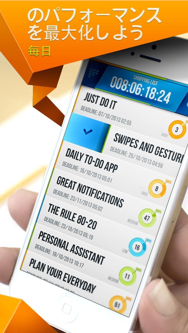 App Storeより引用毎日の生活を最高のものにしましょう。私達は初心者でも上級者でも簡単に使える、革新的なアプリケーションを作りました。過去を振り返ってみると、私達は多くの時間を不必要なことに費やし時間を浪費してきました。そこで今回、紹介するのは「Just do it!」です。これはpriorization methods(ABC scheme)を用いたシンプルですが強力なタスク管理ツールです。また、ParetoMethodsと呼ばれるメソッドを組み込んだ革新的なアプリケーションです。様々なタスクをこれで管理しましょう!