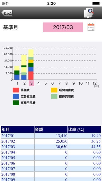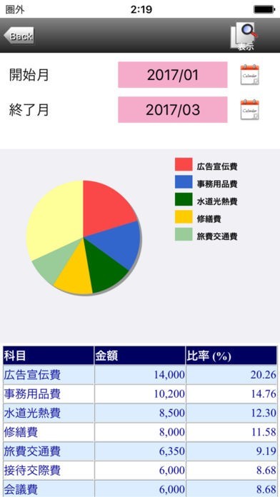 入力したデータは様々な円グラフや推移グラフで表示することが可能なので、データを視覚的に分かりやすく確認できます。データは集計一覧でまとめて確認することもできます。