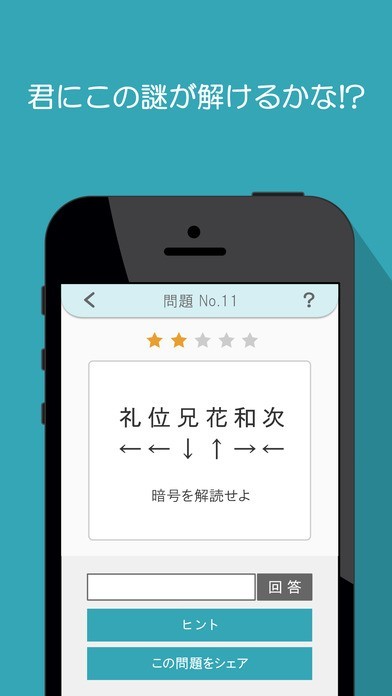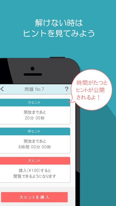 多彩な謎や暗号に挑戦するクイズゲーム「謎解きカフェ」 基本はタップとスワイプだけで出題に解答できる一方、収録されている問題の多くは中学生レベルから挑戦可能となっており、幅広い年代の方が楽しめるのが特徴です。 行き詰ってしまったクイズには、ヒントの利用も可能。 小ヒント、中ヒント、大ヒントの3種類が用意されており、それぞれ時間経過と共に公開され、さらに自分の腕前に応じて選ぶことができます。 また、シェア機能を利用すれば、SNSの友達と一緒にワイワイ盛り上がりながら、クイズを解くことができるようになっています。