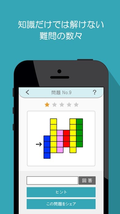 このアプリでは仕事や勉強で疲れたときに頭の体操ができます。1ステージは1問のみです。正解したら次のステージに進むことができます。全部で40問あり、色々なバリエーションが楽しめるので飽きませんよ。なかなか解けないときは、ヒントが出てきます。20分後に小ヒント、6時間後に中ヒントが表示され、大ヒントは購入すると見ることができます。友達に相談したいときは、シェア機能を使うこともできます。Facebookなどで問題をシェアして一緒に考えてもらうことも可能。問題はステージを進むたびにどんどん難しくなっていきます。あなたはすべてクリアできるでしょうか? ぜひ挑戦してみてくださいね。