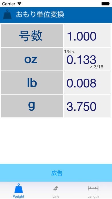 おもり、ライン、太さ、強度、長さについて、それぞれ良く使用される単位をひととおり網羅しており、シンプルなユーザーインターフェースと大きな文字で非常に使いやすくなっています。