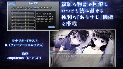 ゲームを途中で中断したり、後半になってくると、複雑な設定、登場人物など記憶が曖昧になることがありますが、この作品では図解で、分かりやすくあらすじを読み返す機能があるので、安心です。