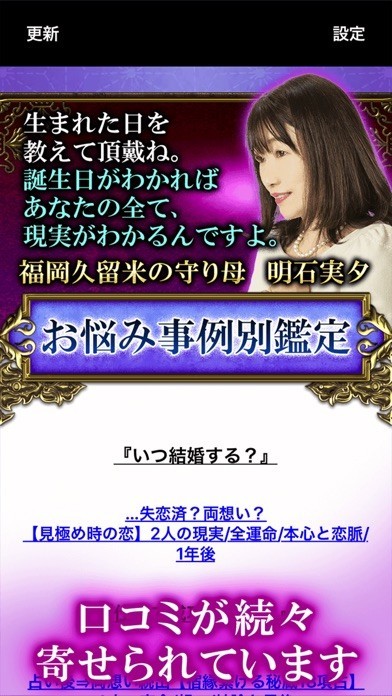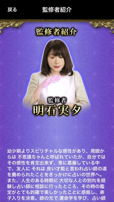 「福岡久留米の守り母」の異名を持つベテラン占い師・明石実夕氏。長きにわたり風水学を学び、占い師としてだけでなく、講師としても活動しています。このアプリでは、本場仕込みの風水を使い、相談者のあらゆる悩みにお答えします。