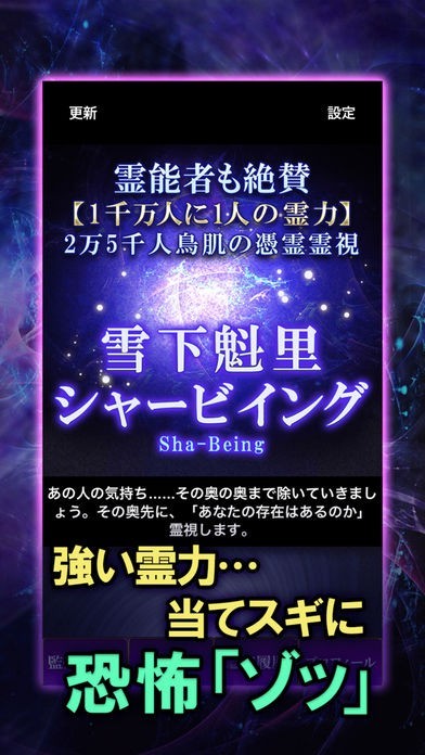 App Storeより引用強すぎる霊力……当てスギ『ゾッ』25000人が体験した、鳥肌ものの的中力と霊力を持つ憑霊師「雪下魁里」。ビジョンで現実見せる霊視占いがついにアプリに降臨。