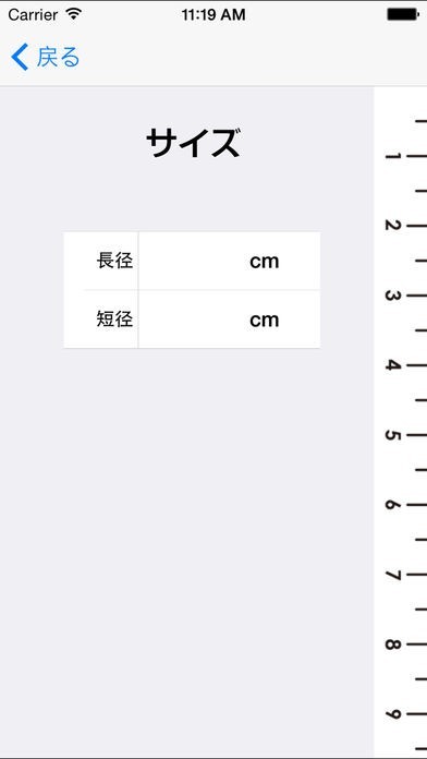 サイズ機能があります。長径と短径を入力します。画面の右側に定規が表示され、サイズを測るときに使え、アプリで測定しながら入力していきます。定規の必要がなくなり便利です。
