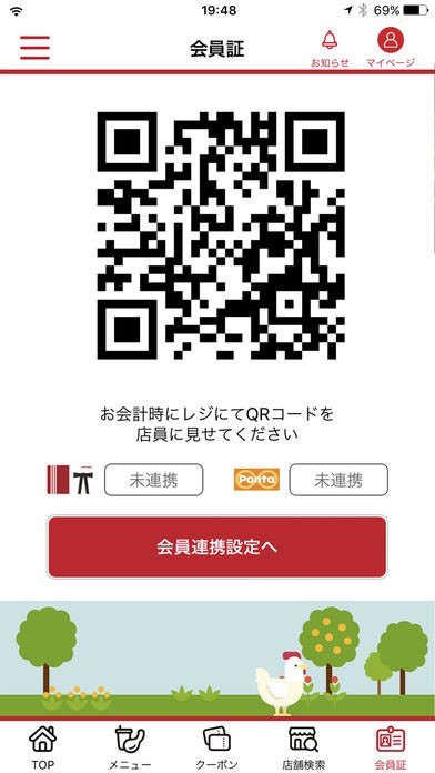 所持している会員カード情報と連携せずにデジタル会員証としての機能を使用することもできます。会員カードと連携しない場合、貯まるのはアプリ独自のポイント"チキンマイル"で、貯まったマイルはポイント同様お会計時に合計金額からマイル分を差し引くことができます。