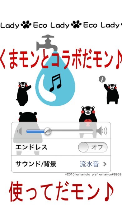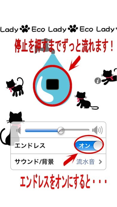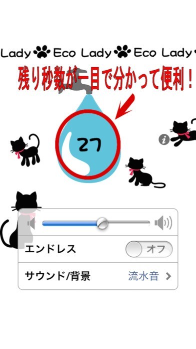 「【無料のトイレ擬音装置】EcoLady」は、トイレ使用時の音をカバーすることができるアプリで、音姫などの流水音再生装置が設置されていないトイレでも安心して利用することができます。 利用時に音が止まるまでの時間も一目で分かり、エンドレス再生で長時間の利用も可能となっています。 音量はスライダーで簡単に調整して使用できます。