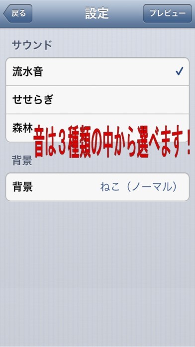 流水音とせせらぎ、森林の3種類のサウンドから好きな音を選んで利用することができます。一般的な流水音もいいのですが、森林やせせらぎの音でリラックスするのもオススメです。