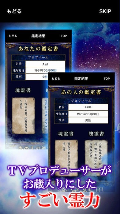 占いでは、霊体を書に落とすとプロフィールと一緒に鑑定書が出てくる