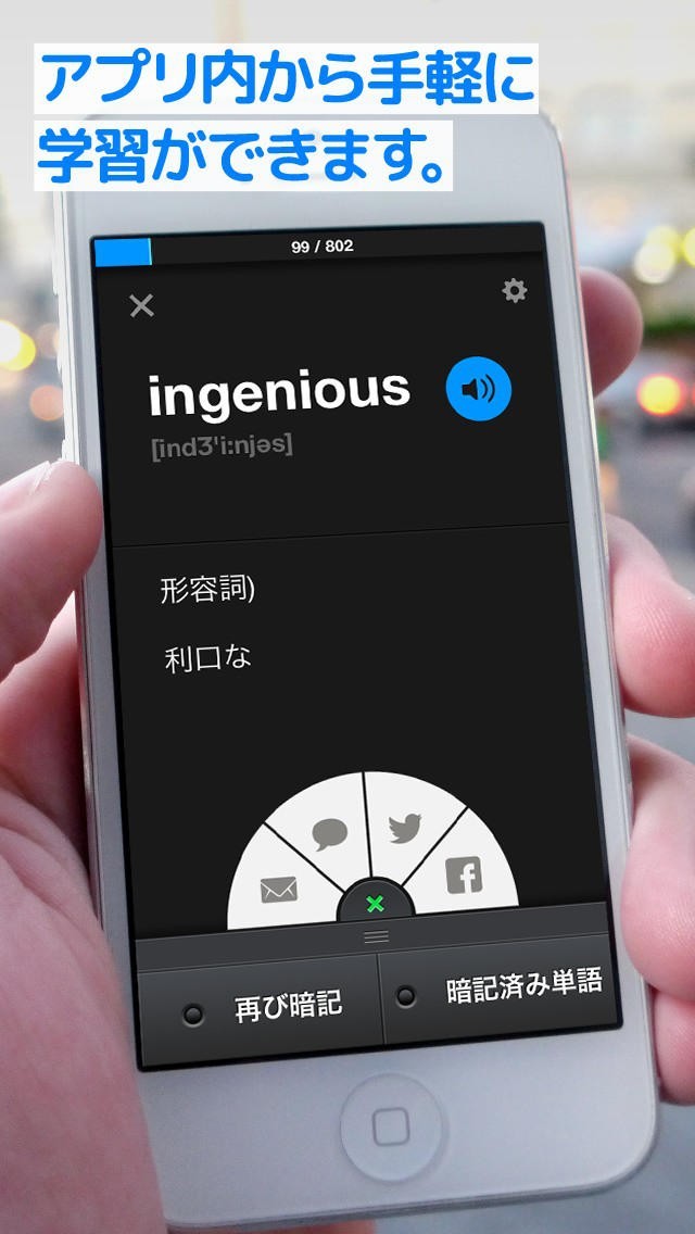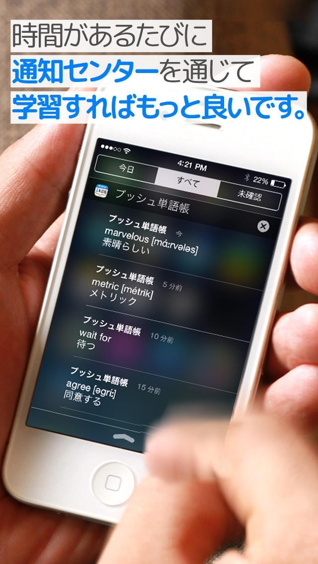 App Storeより引用'プッシュ英語単語帳' は単語、意味、発音をプッシュで送ってくれるので、アプリの起動無しにプッシュを通じて片手間に単語を覚えることが出来ます。
