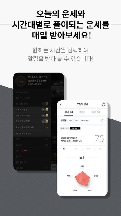 대충 다운로드 받아서 보고 지우는 그런 운세 서비스가 아니라 꼭 볼 수밖에 없는 운세의 끝장을 보기 위해 만든앱입니다.
