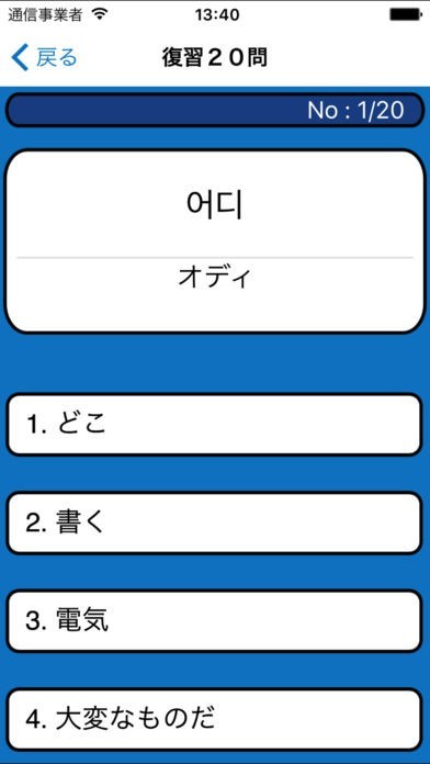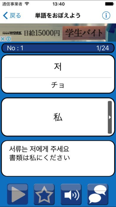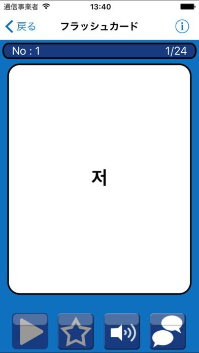 基本的な韓国語を理解するのに必要な単語が収録されています。全ての単語に意味とカタカナの読みが付いていて、例文も見ることができるので総合的に理解できます。ネイティブによる韓国語の発音も収録されているので、リスニングのトレーニングもできます。 フラッシュカード機能で効果的に復習でき、クイズ機能でハイスコアを目指しながら習熟度を確認できるので、ゲーム感覚で楽しみながら韓国語の勉強ができます。覚えられない単語はお気に入りリストに入れておけばすぐに見直せます。