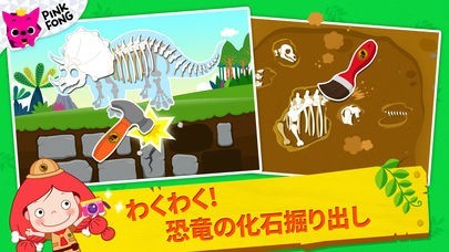 石を割り、土を掘っていく化石掘り出しゲームが搭載されているので、手軽に化石を掘っている気分を体験できます。化石を全て掘り出すと、一体の恐竜になって動き出します。