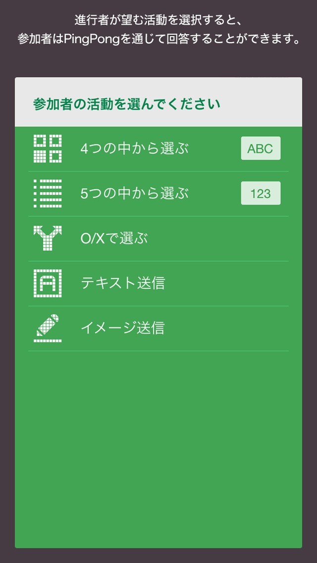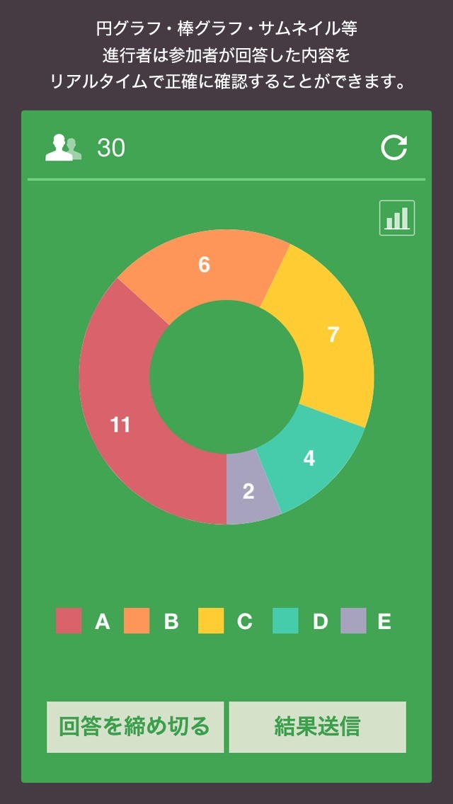 授業、講義、会議などで使えるコミュニケーションツールアプリです。進行者が参加者に対して質問を投げかけると○×、画像、テキストなど多くの形式での回答を得ることができます。回答結果はグラフやリストなどにまとめることができるので瞬時に回答結果を正確に把握することが可能です。 Evernoteと連携しているので、Evernoteに資料を保存しておけば参加者と共有することができます。イベントのプレゼント企画にも使える当選者の抽選機能もあります。