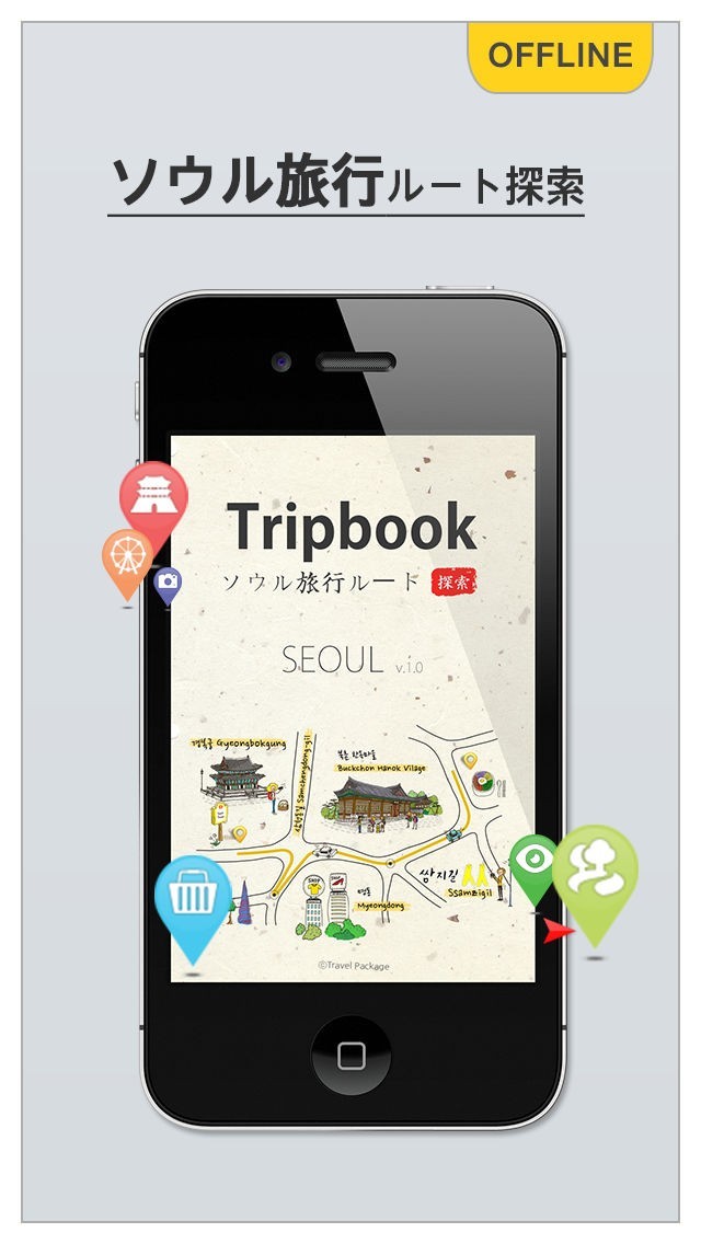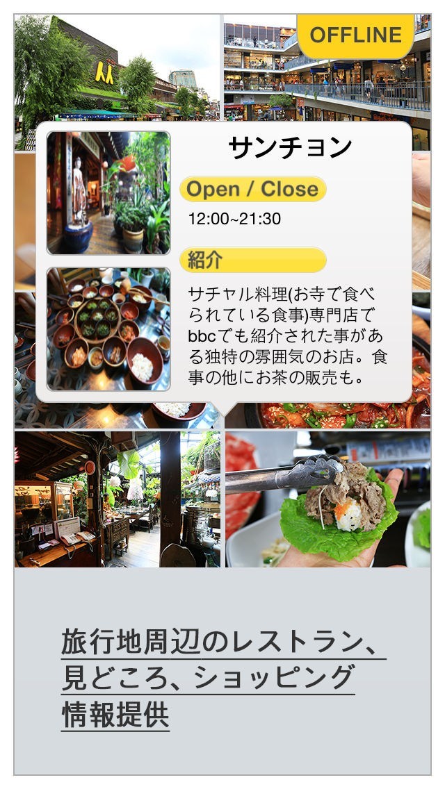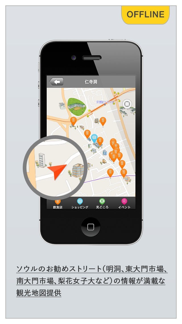 - 仁寺洞、明洞、北村、梨花女子大学通り、梨泰院、南大門、狎鴎亭ロデオ通り、大通り、弘益大学校など総10軍隊通りのレストラン、観光スポット、ショッピング情報が入った旅行向け地図提供