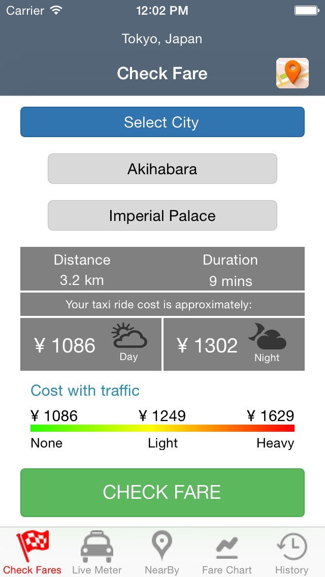 This app help to check taxi fares in all major cities in Japan. You can check fares for any two places while sitting at home or office. It also shows path between source and destination address.