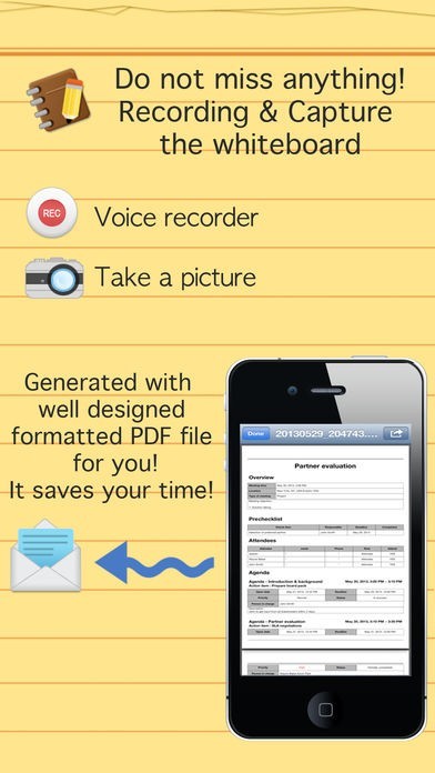 App Storeより引用それはよく組織議事録である - 、準備(写真、音声録音付き)すべてのものに注意し、PDFファイルに議事録生成する。