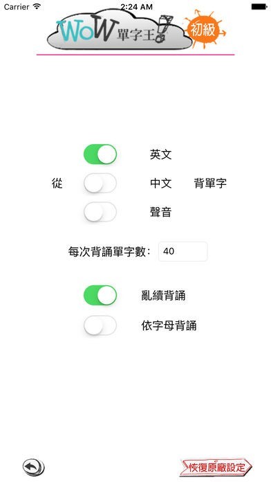 A.進入本app後,您可以先設定您每次要背誦字數,設定您要從英文單字背單字,即主背誦頁面會僅顯示英文。