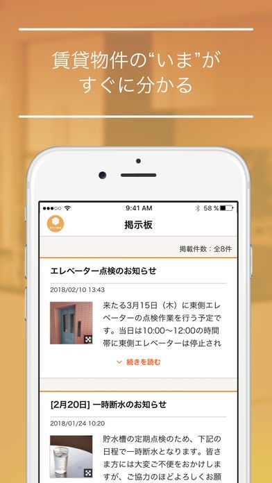 管理会社からのお知らせを見ることができます。物件の掲示板の内容もアプリで知ることができるので、点検や工事の日にちなど、簡単に確認できます。