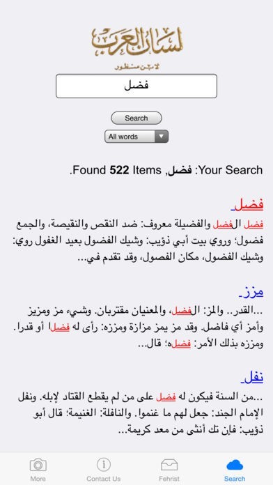 * وتشمل نتائج البحث جذور الكلمات الرئيسية بالإضافة إلى الكلمات داخل التعاريف؛