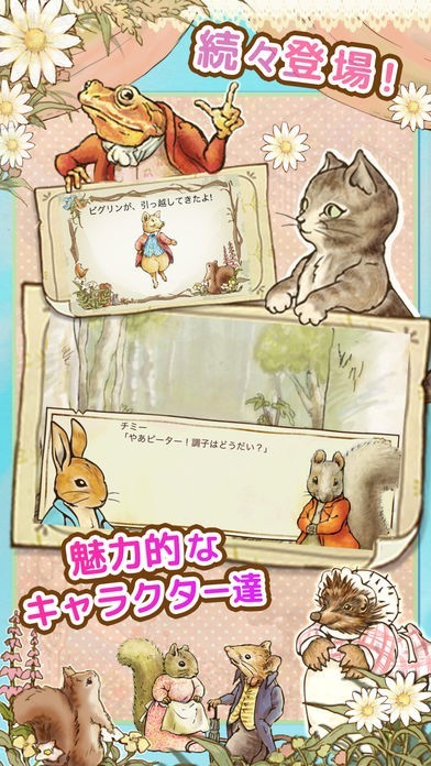 あの絵本の世界観であなただけのピーターのお庭を作りましょう。最初は何もないので野菜を作って、収穫したら森に売りに行きます。全てはここからがスタートになります。住人に野菜を売ることでコインと経験値を得られますし、交流が始まります。交流が深まると仲間ができて引っ越して来てくれます。レベルが上がると村や町に出かけることが可能になって、いろいろな仲間に出会うことになります。住人からは家賃収入が得られるので住人が増えれば、益々箱庭が発展することになります。かわいいデコレーションで飾り付ければオリジナルの庭の出来上がりです。友達をあなたの庭に招待して自慢しましょう。