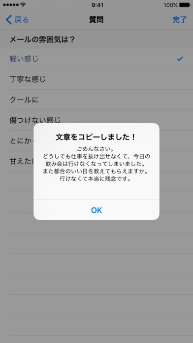 ドタキャンする理由、次回の予定、雰囲気などを選ぶだけで、誠意のある文章が簡単に作れる便利なアプリです。