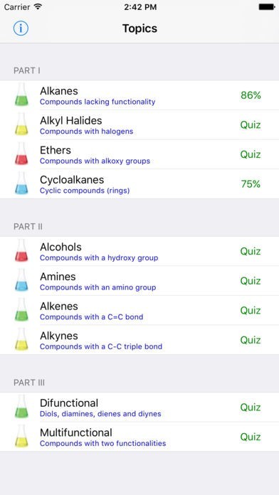 App Storeより引用Learn Organic Chemistry: Nomenclature 1 will help you master the naming of organic compounds. It features clear, concise, interactive lessons on how to name compounds with functional groups commonly encountered in a first semester organic chemistry course. Each lesson includes a quiz to help you practice what you've learned and evaluate your level of comprehension.