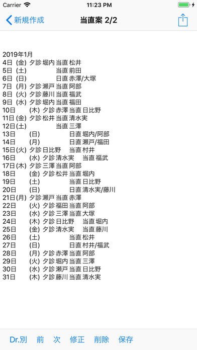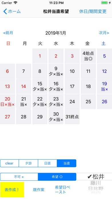 3. 当直表作成:画面右下のピッカーから医師名を選択し、各医師の希望日・不可能日をカレンダーに入力します。すべての医師の希望日・不可能日を入力したら「表作成!」ボタンを押します。すると瞬時に当直表が作成されます。