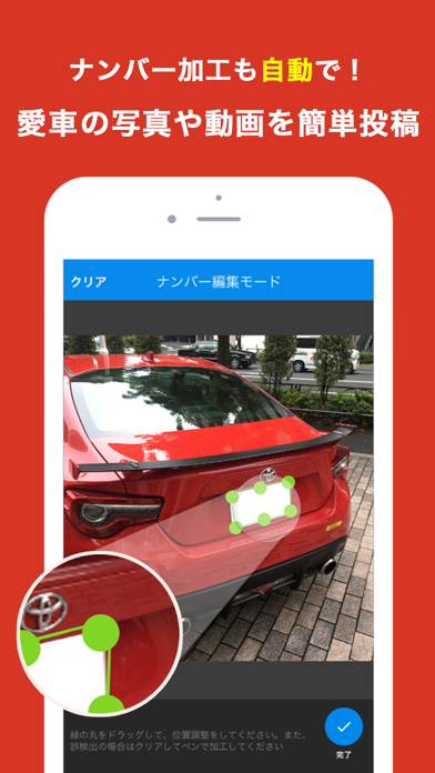 自慢の車の写真をアップする前に、プライバシーに関連するナンバープレートの部分は画像加工で隠すこともできます。加工はアプリが自動で行ってくれるので手間もなくスムーズです。