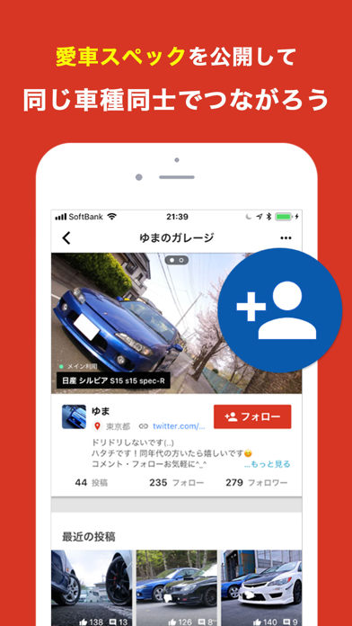 自分の車のカスタマイズやカラー、車種などについて、車好き同士でしか分かり合えない話を投稿したり、他のユーザーの投稿をチェックしたりして、趣味の合う友だちを増やせます。