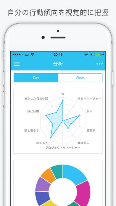 ・【行動傾向をチャートで可視化】アイデンティティやゴール毎の行動(タスク)の偏りをチャート化することで、自分の行動傾向を可視化できます。