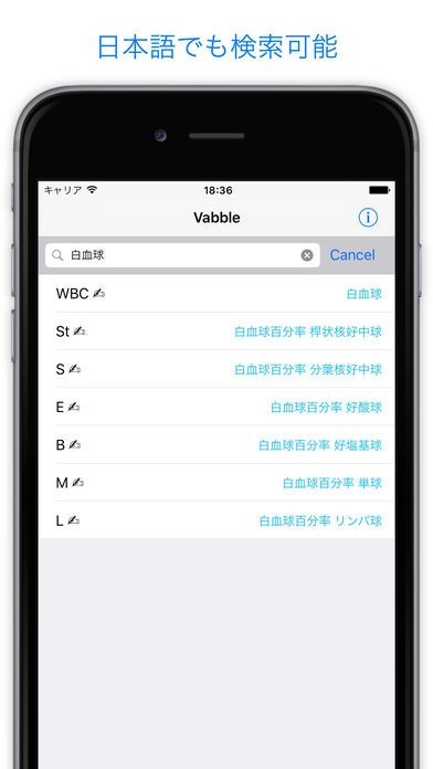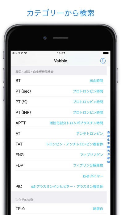 App Storeより引用医療現場で臨床検査値を見たときや国家試験の問題を解いたときに基準範囲の分からない、もしくは略語の分からない検査値はありませんか?基準範囲検索アプリ「Vabble(バブル)」は臨床検査において使われる約180項目の検査値を素早く調べることができます。