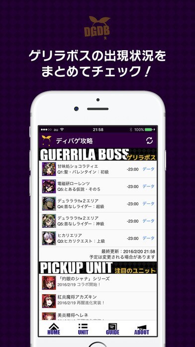 大人気のスマートフォン用ゲームアプリのディバインゲートの攻略に役立つ情報をまとめているのが「攻略データベース for ディバゲ(ディバインゲート)」です!すべてのユニットのプロフィールやスキル、ステータスはもちろんのこと、ゲリラ的に出現しているボスの情報などもいち早くキャッチすることが出来るようになるアプリです!お気に入りに登録したユニットの情報はすぐにチェックができるようになっているのでファンには間違いなくオススメです!