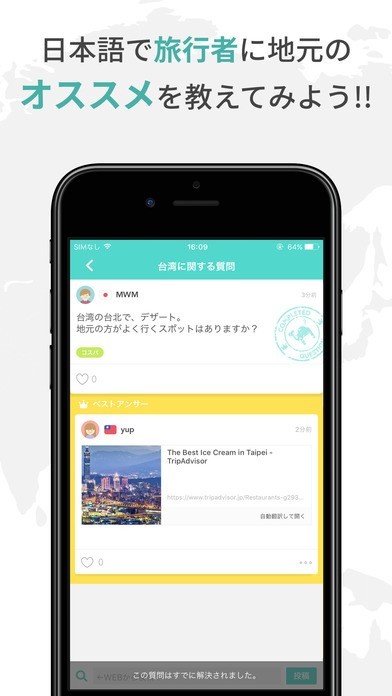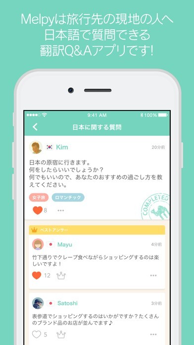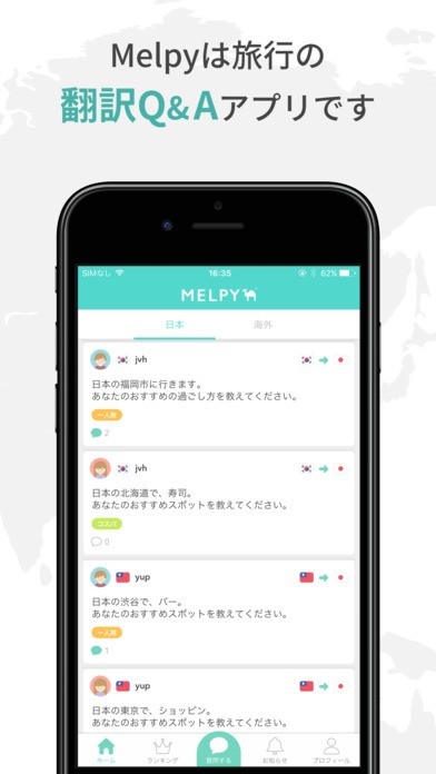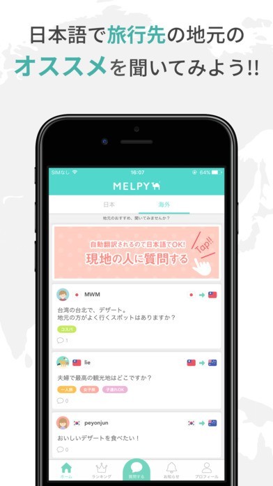App Storeより引用Melpyは、あなたの母国語で旅行先の現地ユーザーに質問できる、翻訳Q&Aアプリです。