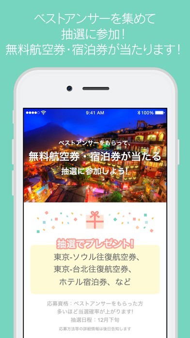 ベストアンサーを集めると、無料で海外旅行航空券・宿泊券が当たる抽選に参加することができます。