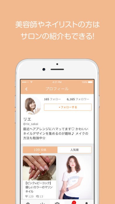 記事を掲載している美容師やネイリストのサロン予約をアプリから手軽に行うことができます。お気に入りのヘアアレンジやネイルデザインを掲載している美容師やネイリストを見つけてフォローしておくと予約を取るときに便利です。