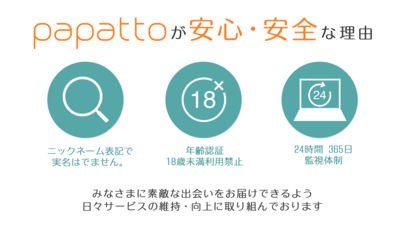 「papatto(パパット)」は夢を追う女性と経済的にゆとりのある男性が登録してパパ活をするためのアプリです。 パパ活専用アプリなので、お互いの求めているものが明確なのでマッチングしやすくなっています。 お互いにいいねを交わせばマッチング成立となりメッセージのやり取りを行うことができるので、ハードルが低く高確率で理想の相手を見つけることが可能です。