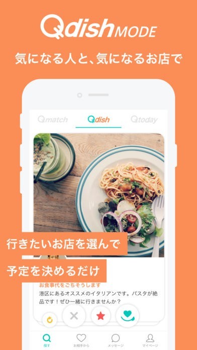 予算を設定出来る「Qdishモード」が搭載されているので、マッチングした相手と食事する際に便利ですよ。ニックネームで登録出来るので、安全にサービスを利用したい方にも重宝します。