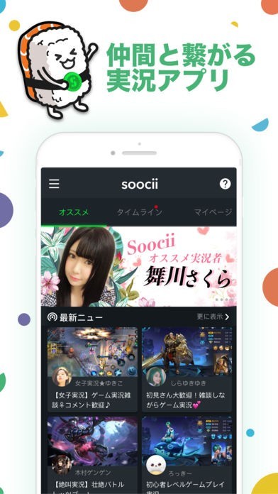 App Storeより引用Soociiはスマートフォンゲームの実況配信動画や、ゲーム仲間を作って友達とリアルタイムチャットが楽しめる高機能配信アプリ。さらに豊富なゲーム情報が満載で、全てのゲーム体験を一台のスマホで完結できるサービスです。