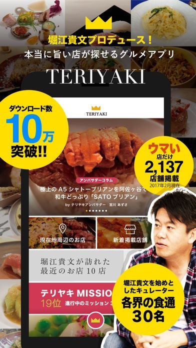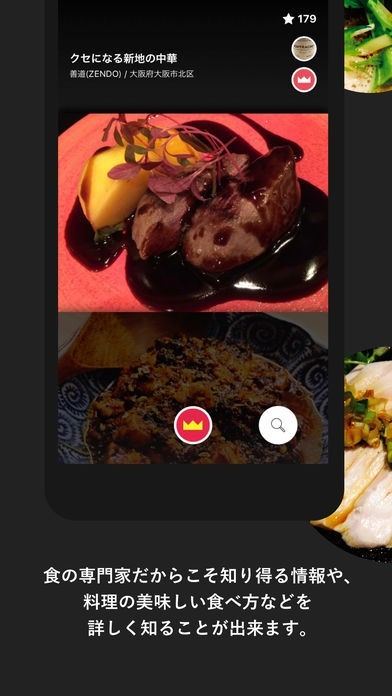 ホリエモンとしておなじみの堀江貴文氏がプロデュースしたグルメアプリです。 30人のグルメ専門家が厳選した店だけが掲載されていて、料理の写真や実際に食べてみての感想も見ることができます。 ここでしか読むことができないコラムやおすすめのデートコースの紹介もあるので、店選びの参考になるだけでなく読み物としても楽しめます。