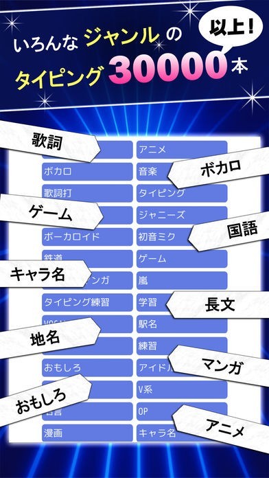 タイピングのお題は、歌詞やゲームなど多様なジャンルが用意されています。スマホ入力の練習になるだけでなく、クイズを解く感覚で地名や歌詞の答えを覚えていくこともできます。