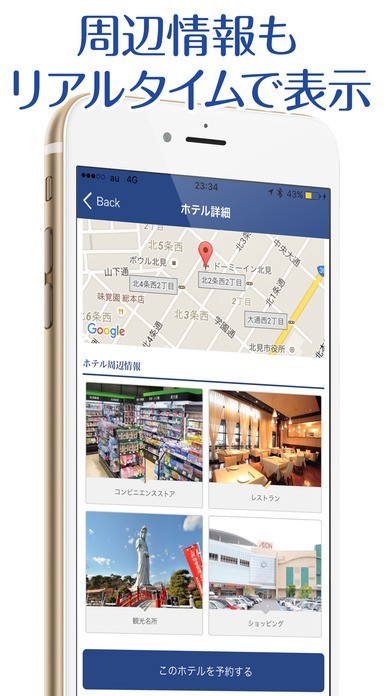 「ドーミーインホテル予約アプリ」は、公式ツールとして便利な機能を多数搭載しています。メインとなる予約機能を使えば、全国の系列ホテルの中から選んで予約が可能。宿泊料金やプランの確認も同時に行えるため、もっともお得な宿泊プランを狙うことができるでしょう。部屋残数表示機能なども充実。部屋の残り数をチェックしながら、焦らず予約をかけられます。また、地図機能も用意しており、使いやすい地図とともに周辺情報をリアルタイムで表示してくれるのも便利なポイントです。宿泊前に立ち寄りたいコンビニを探したり、昼食用のレストランの確認をしたりと多岐に渡って活躍してくれます。