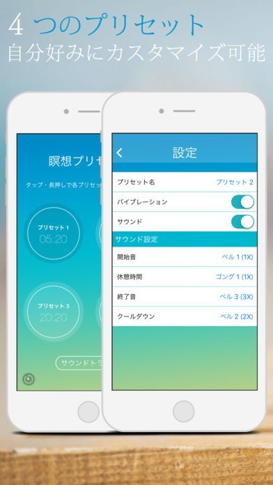 瞑想や読書タイムなど心を落ち着けたいときに使えるタイマーの設定は4種類まで保存しておくことができます。同じ設定を何度も入力手間を省くことができるだけでなく雰囲気づくりにも貢献してくれます。