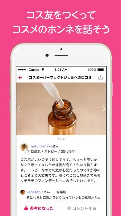 *コスメの本音をチェックしたら、参考になった!やコメントを返してもっと詳しく聞いてみよう!コミュニケーションがとれるからコス友たくさん作って、コスメの話で盛り上がろう。