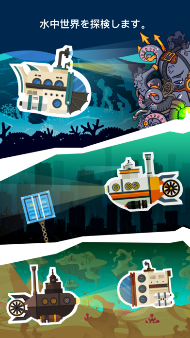 海に沈んでしまった世界を潜水艦に乗って冒険するゲームです。海底資源や都市を探索してアイテムを入手すれば、潜水艦をパワーアップすることができます。待ち受ける敵や危険地帯を乗り越え、すべての海を走破してください。