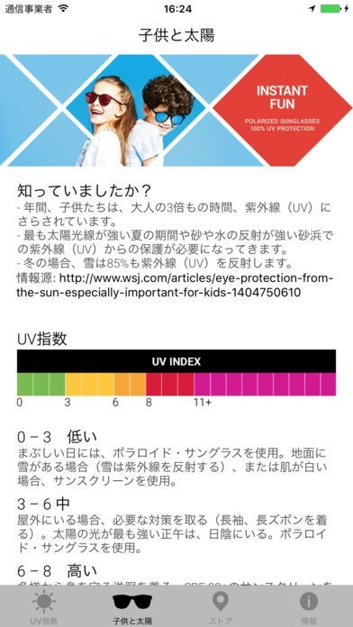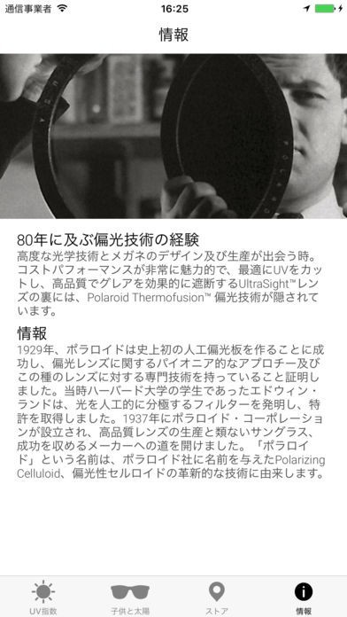Polaroid UVでは地図の表示に合わせ、ポラロイドアイウェアの店舗や取扱店舗も分かるようになっているため、いざというときのメンテナンスの依頼なども便利になっています。