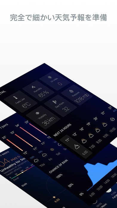 アプリで知ることができるのは天気予報だけではありません。気温、体感温度、湿度、可視性、気圧など、数多くの情報を手に入れることができます。各地点の詳しい天気予報をチェックしましょう。